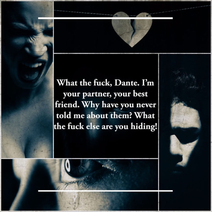 “Snooping around? Snooping around?” He wondered if she realized her heritage was showing. Her Irish accent was stronger. “Kain and Ifrit were playing a bit too hard and knocked the door of its hinges. I walked out and found it. I wasn’t fucking snooping around. I was walking out of the fucking bedroom we both share. What the fuck, Dante. I’m your partner, your best friend. Why have you never told me about them? What the fuck else are you hiding!” She followed him.