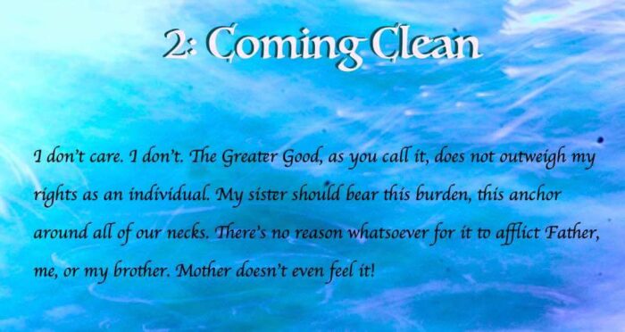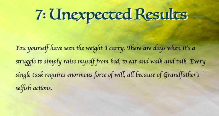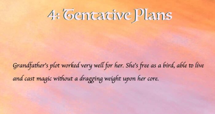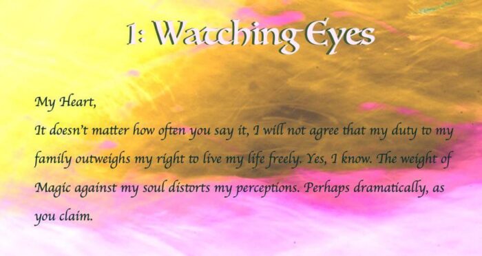 It doesn’t matter how often you say it, I will not agree that my duty to my family outweighs my right to live my life freely. Yes, I know. The weight of Magic against my soul distorts my perceptions. Perhaps dramatically, as you claim.