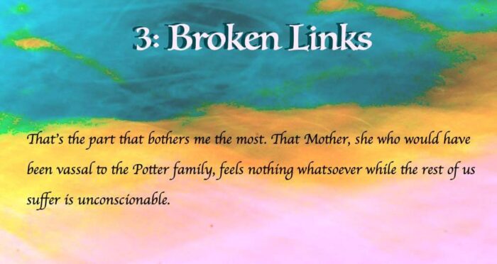 I’ve only read the first part so far. I like your take on a pragmatic and caring Harry, and the dramatized humor of Sirius Black and some of the other adults. The curse beyond the Potter hair extrapolation is interesting and different than any I’ve read before. I also liked how you did the house, the cleaning and the wardstones.