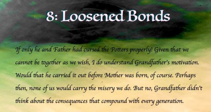 Oh wow. This was brilliant in so many ways. All those questions asked. Logic connecting thoughts. The Potter factor. The beings who actually care. The consequences of actions. The plans in plans. The not knowing the full puzzle. Oh so much yes. Also, just today I sat thinking I need maybe to write fic with Marcus and Her and inner workings of Black magic poking its people to Do Things – and you are here to the rescue.